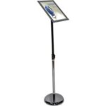 Chrome finish holder, post and circular base- Holds 8.5″W x 11″H literature- Telescoping post offers variable heights from 30.5″ up to 48″- Frame can be rotated 360° or at any desired angle