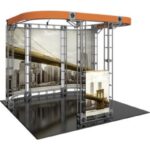 10′ x 10′ kit size- Custom appearance- Toolless assembly- Simple twist and lock design Kit includes:- 12 x 6-way junction boxes- 1 x 24″ straight truss lengths- 6 x 36″ straight truss lengths- 11 x 46″ straight truss lengths- 6 x 90º curved truss length- full set of quicklock connectors- 4 x junction bases- 1 x 24″ internal shelf*- 3 x Lumina 1, 50 watt spotlights- 2 x OCF molded cases Graphic materials: Dye sublimated fabric or UV printed panels*Shelf max weight = 25 lbs / 11.34 kgs*Shelf color options: silver, black, mahogany, natural