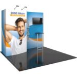 Silver aluminum extrusion frame- Single-sided SEG dye-sublimated fabric graphics- Easy step-by-step instructions- Kit includes frame, three fabric graphic panels, one table, two 200 LED floodlights, one medium monitor mount*, three literature holders and two molded OCH2 cases- Lights Included: Lumina 200 LED floodlight, straight arm and adjustable head, black finish, 19.5″ from end to end – Medium monitor bracket holds 32-55″ monitor*, maximum weight: 50 lbs / 22.68 kgs – Table hold max weight: 25 lbs / 11.34 kgs- Tables: 21″W x 40.5″H x 19.7″D approx.- Tabletop color options: Silver, Black, Mahogany, Natural *Monitors not included