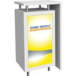 Laminate cabinet and accent L-shape panel are available in four color options: dove grey, black, designer white and fusion maple – Rental counters available in designer white laminate option only – Vinyl graphic is on the front-facing locking storage door – Durable aluminum extrusion feet and L-shape accent offsets – Counter can hold a max weight of 25 lbs – Easy step-by-step instructions – Kit includes laminated cabinet, locking storage door, vinyl graphic, L-shape laminate accent