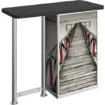 Custom appearance- Easy to assemble- Aluminum frame construction – UV graphic panels- Rear locking door- Internal shelf- Tabletop available in four finishes: silver, black, mahogany and natural- Straight legs can turn 90° for a different look- Counter can hold a max weight of 50 lbs- Installation tool included- Optional tabletop, leg and graphic customizations available- Interior Cabinet Dimensions: 22″W x 38″H x 12″D- Tabletop Dimensions: 45.9″W x 1″H x 21.2″D