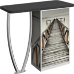 Custom appearance- Easy to assemble- Aluminum frame construction – UV graphic panels- Rear locking door- Internal shelf- Tabletop available in four finishes: silver, black, mahogany and natural- Tusk-Legs can turn 90° for a different look- Counter can hold a max weight of 50 lbs- Installation tool included- Optional tabletop, leg and graphic customizations available- Interior Cabinet Dimensions: 22″W x 38″H x 12″D- Tabletop Dimensions: 45.9″W x 1″H x 21.2″D