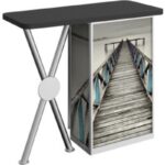Custom appearance- Easy to assemble- Aluminum frame construction – UV graphic panels- Rear locking door- Internal shelf- Tabletop available in four finishes: silver, black, mahogany and natural- V-Leg can turn 90° for a different look- Counter can hold a max weight of 50 lbs- Installation tool included- Optional tabletop, leg and graphic customizations available- Interior Cabinet Dimensions: 22″W x 38″H x 12″D- Tabletop Dimensions: 45.9″W x 1″H x 21.2″D