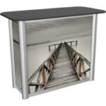 Custom appearance- Easy to assemble- Aluminum frame construction – Rigid graphic panels covering all sides of the counter- Rear locking door with custom graphic panels- Tabletop available in four finishes: silver, black, mahogany and natural- Counter can hold a max weight of 75 lbs- Includes OCH2 molded shipping case