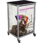 Portable, pre-assembled aluminum frame- Zipper-enclosed storage space – Printable graphics on sides & front- Top comes in your choice of black- Locking wheel casters- Kit includes frame, two shelves and carry bag