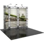 10′ x 10′ kit size- Custom appearance- Toolless assembly- Simple twist and lock design Kit includes:- 8 x 6-way junction boxes- 8 x 36″ straight truss lengths- 4 x 46″ straight truss lengths- 2 x 90° curved truss lengths- 1 x full set of quicklock connectors- 2 x adjustable tabletops*- 3 x Lumina 1, 50 watt spotlights- 1 x OCF molded case (OR 4 x OCH2 molded cases) Graphic materials: Dye sublimated fabric or UV printed panels*Tabletop max weight = 25 lbs / 11.34 kgs*Tabletop color options: silver, black, mahogany, natural