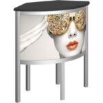 Features rigid sintra graphics and simple extrusion based frames- Back of counter features a locking door with a rigid infill and provides access to storage – Choose from four tabletop finishes: silver, black, mahogany and natural- Easy step-by-step instructions- Counter can support a max weight of 50 lbs